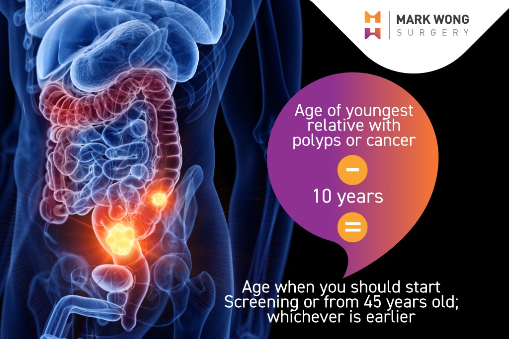 In view of rising trend of young Colorectal Cancer patients, below the age of 50 years old, the American Cancer Society now recommends that people at average risk for Colorectal Cancer should begin screening at age 45 years3. If your family has a medical history of Colorectal Cancer or precancerous polyps, speak with your doctor about screening early. The math works like this: Take the age of the youngest affected relative when they were diagnosed with polyps or cancer. Subtract 10 years from that number and that is the age when you should start screening or from 45 years old, whichever is earlier. For example, if your father had cancer at 52 years old, you should consider beginning Colonoscopy at age 42 years.